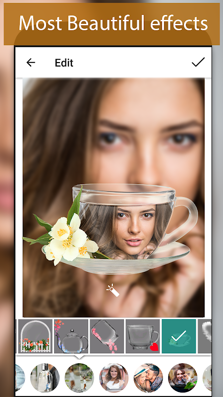 Use different PIP styles in the app to make your selfies and photos original and beautiful. There are many styles in the pip collection. You can put photos in the glass, cup, mirror, the tablet, snowflake, car mirror and etc.