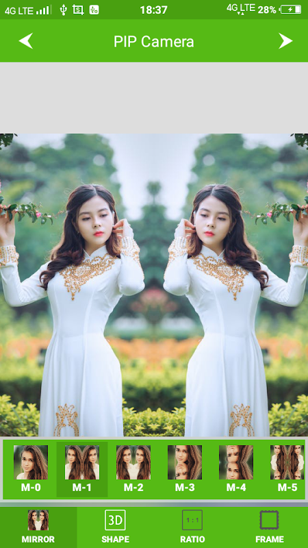 PIP Camera allows you to create mirror effect with your photos. You can create left -right, up - down, reflection, repeating reflection style photos with PIP Camera