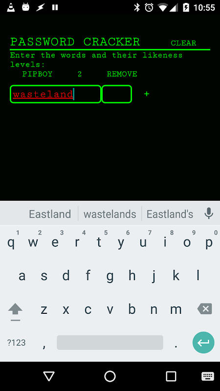 Simple tool to help hack terminals in the vast wasteland. Enter the words you have tried and their likeness levels. The text of each successive word will be green if it is possible to be the password, yellow if it is too short, and red if it is impossible for it to be the password. For best results, pick your first word at random and then make sure each successive word you try is possible (green) to continue.