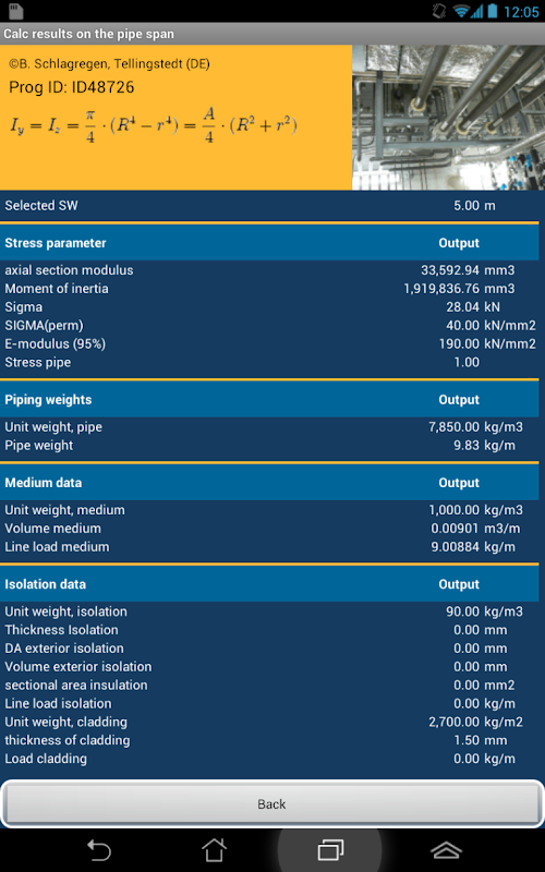 With given parameter like nominal diameter, wall thickness, Sigma(stress allowed, the E-modulus of elasticity, the additional parameters of insulation like thickness of insulation, unit weight of the insulation, the thickness of the cladding for to cover the insulation, the axial WM and never the less the Moment of inertia the deflection will be calculated automatically by the app. The stress SIGMA is calculated acc. to the real appearance of the line loads based on the input by the user.