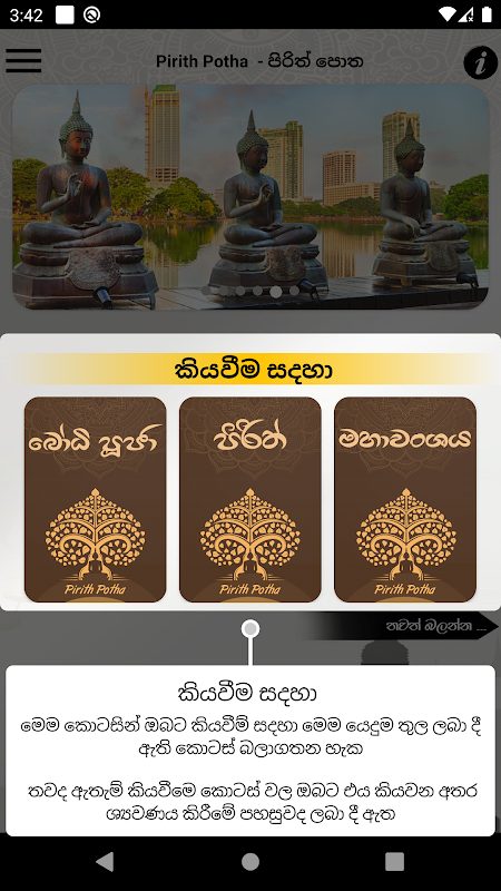 This app is designed to listen and read Pirith and Bodhi Pooja.