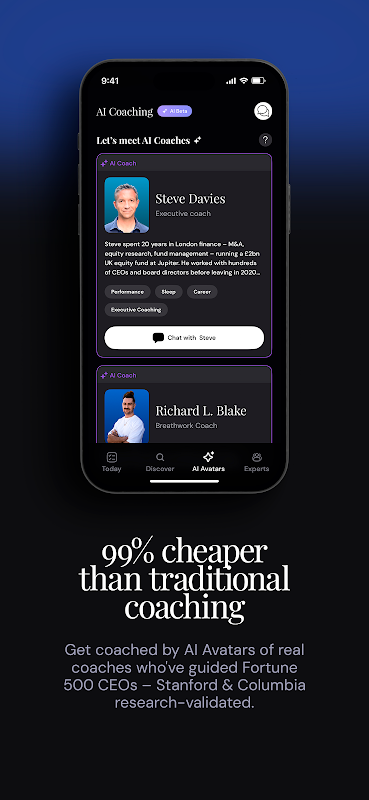 Experience a new kind of coaching with AI Avatars: digital coaches trained by top-tier experts and available 24/7.