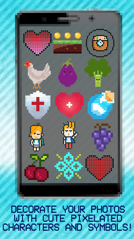 ⬛ ◼ ◾ Decorate your pictures with pixel graphics and you will almost have the real feeling of playing vintage video games! You are the one who chooses which cute stickers for photos will have the honor of embellishing your dearest memories. This pixel art creator with kawaii stickers will be the cutest addition to your personal collection of photo editing apps. These video game stickers will refresh every picture and give you a virtual ride through time. There are plenty of shapes that you can choose: emoticons, flowers, fashion accessories, hair styles, comics, glasses, festive themes, animals, rock styles, birthday themes, rainbows, unicorns and many, many more! So add funny stickers to photos and observe how a brand new scene slowly takes shape! Grab your selfie camera, equip yourself with the enthusiasm of the 80s retro gamers and take some time to play with your creativity inside this kawaii photo booth!