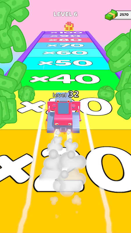 Swipe the screen to control the car to avoid the surrounding obstacles, collect upgrade parts to upgrade the car, crash the car below its own level, and finally sprint to hit the giant.