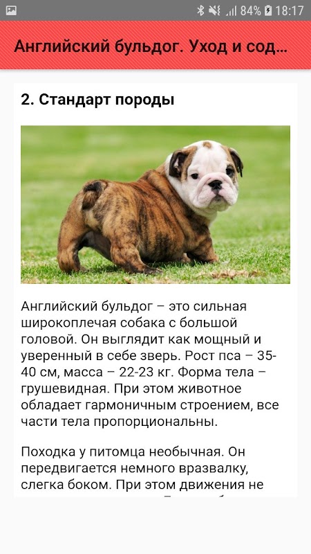 Английский бульдог – средняя, гладкошерстная, порода собак. Это достаточно послушная и очень спокойная собака. Английский бульдог по характеру достаточно ласковый, но своим грозным видом легко может заменить сторожевую, и хозяина или свою территорию будет очень преданно охранять. Английский бульдог — порода собак, которая считается английским национальным достоянием. Выращивать этого домашнего питомца по карману только обеспеченным хозяевам. Постоянно нуждающийся в уходе и заботе о своём здоровье любимец, не оставаясь в долгу, отвечает на заботу преданностью и любовью. Эта собака с дружелюбным нравом и неторопливыми повадками — настоящее украшение любого дома.