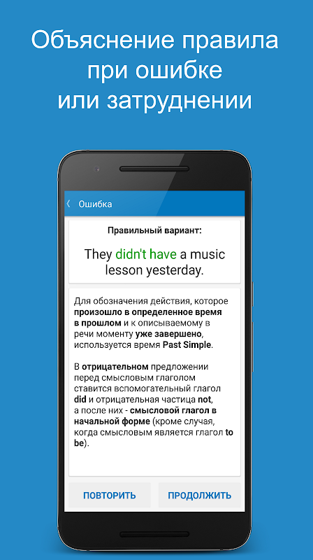 В режиме изучения грамматики предлагается либо выбрать правильную конструкцию из нескольких вариантов, либо составить её самостоятельно из предложенных слов, чтобы получилось корректное с точки зрения английской грамматики предложение. В любой момент Вы можете обратиться к подсказке, содержащей краткий теоретический материал по грамматической конструкции в предложенном задании. В случае ошибки приложение выводит правильное английское предложение и пояснение.