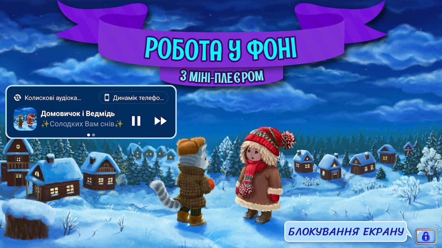 Aby oszczędzać energię baterii urządzenia, aplikacja może odtwarzać bajki przy wyłączonym ekranie. Aby było to dla Ciebie wygodniejsze, dodaliśmy miniodtwarzacz do ekranu blokady i paska powiadomień. Podczas odtwarzania historii audio możesz ukryć wszystkie przyciski aplikacji, dotykając ikony blokady ekranu. Dzięki temu dziecko nie będzie mogło przypadkowo gdzieś kliknąć czy wyłączyć bajki. Wszystkie bajki w aplikacji można słuchać i czytać bez internetu.