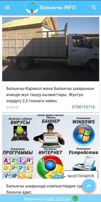 «Балыкчы INFO» мобилдик тиркемеси - Балыкчы шаары жана ага жакын жайгашкан айылдардын тургундарына жаңылык-жарнамалардан кабар берген заманбап тиркеме. Башка группаларга, сайттарга, социалдык тармактардагы баракчалаларга кошулуунун зарылчылыгы жок, Балыкчы шаарынын бардык жаңылык-жарнамалары бир тиркемеде.