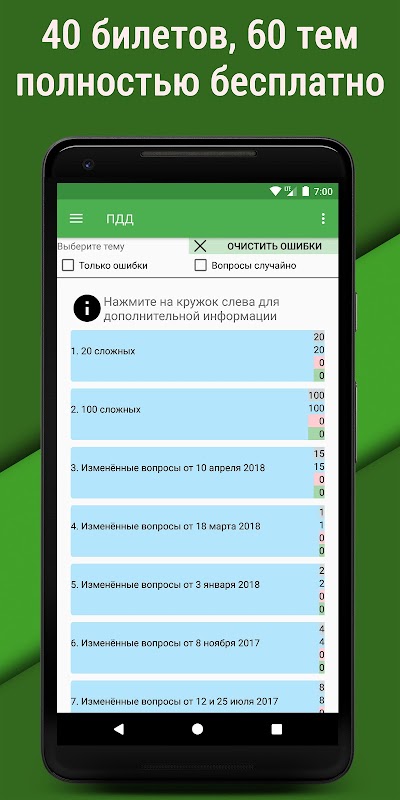 Ta aplikacja jest przeznaczona dla osób uczących się w szkole nauki jazdy, a także dla kierowców, którzy chcą poznać nowe przepisy ruchu drogowego lub przygotować się do zdania egzaminu teoretycznego w policji drogowej Federacji Rosyjskiej.