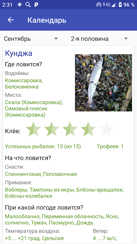 - dowolne połowy w notatniku można łatwo znaleźć według danego zbiornika, ryby, miesiąca, zakresu dat