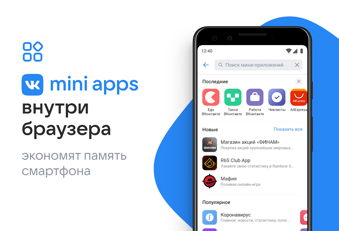 ● Oszczędzaj pamięć smartfona - uruchamiaj swoje ulubione aplikacje bezpośrednio w przeglądarce. Atom ma wbudowane VK Mini Apps , dzięki czemu aplikacje nie muszą być instalowane na urządzeniu i ponownie w nich autoryzowane. Pojedyncze konto VK Connect pobierze dane.