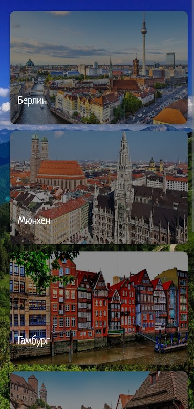 Zdarza się, że podróżujesz sam lub w parze i chcesz wybrać się na ciekawą wycieczkę, ale jest to drogie, ponieważ przewodnik pobiera opłatę grupową. W tej aplikacji możesz znaleźć innych podróżników do wspólnych wycieczek i obniżyć koszty wycieczki. Opublikuj swój post w aplikacji „Koledzy podróżnicy”, a będzie on widoczny dla innych użytkowników aplikacji w promieniu 10 kilometrów. A gdy klikniesz w ikonę „geolokalizacja”, sam zobaczysz inne tego typu oferty w promieniu 10 kilometrów od Ciebie! Dodatkowo w aplikacji możesz wstępnie zapoznać się z miastami Niemiec, wybrać miejsce do podróży, przeglądając zabytki i recenzje wideo. Aplikacja zawiera również informacje o biurach podróży, biurach podróży i hotelach oferujących swoje usługi w wybranym mieście.