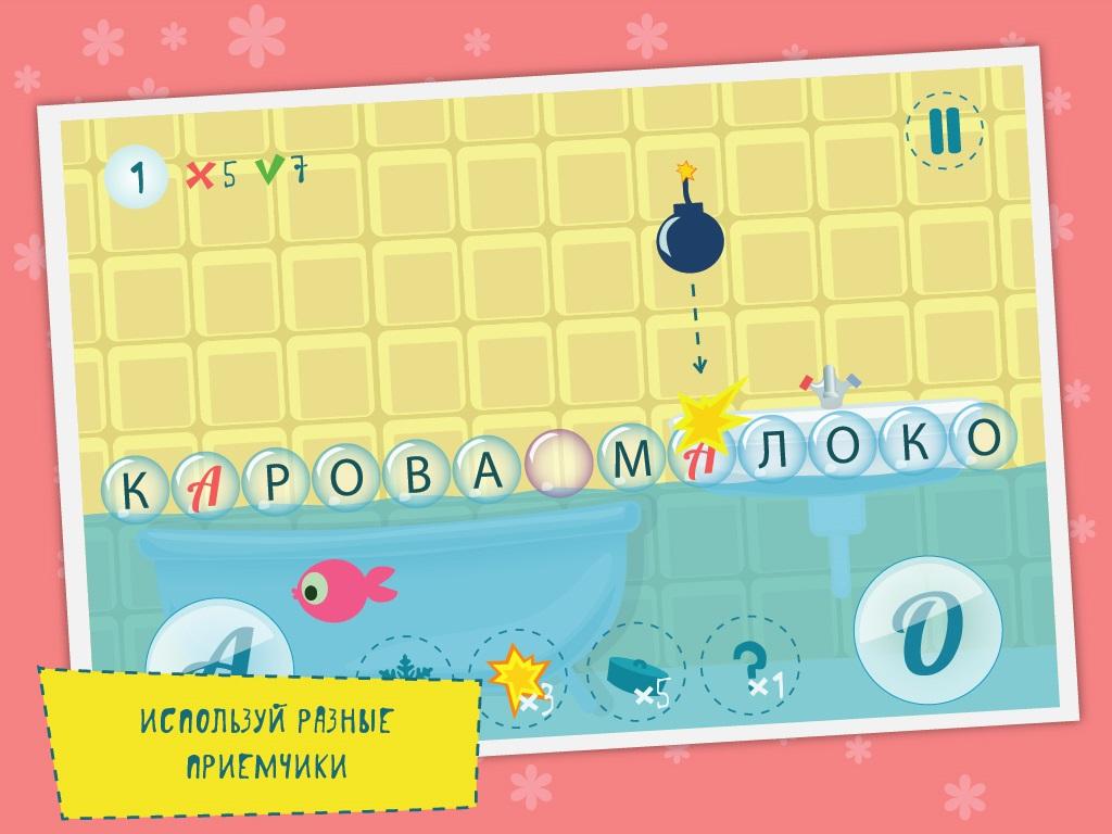 В приложении "Грамотей Кузя - Русский язык" представлены три темы, в каждой из которой 20 уровней. Лопайте слова-пузырики, подставляя правильные буквы.