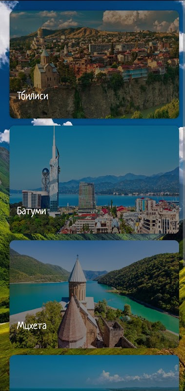 Zdarza się, że podróżujesz sam lub w parze i chcesz wybrać się na ciekawą wycieczkę, ale jest to drogie, ponieważ przewodnik pobiera opłatę grupową. W tej aplikacji możesz znaleźć innych podróżników do wspólnych wycieczek i obniżyć koszty wycieczki. Opublikuj swój post w aplikacji „Koledzy podróżnicy”, a będzie on widoczny dla innych użytkowników aplikacji w promieniu 10 kilometrów. A gdy klikniesz w ikonę „geolokalizacja”, sam będziesz mógł zobaczyć inne tego typu oferty w promieniu 10 kilometrów od Ciebie! Dodatkowo w aplikacji możesz wstępnie zapoznać się z miastami Gruzji, wybrać miejsce do podróży, przeglądając zabytki i recenzje wideo. Aplikacja zawiera również informacje o biurach podróży, biurach podróży i hotelach oferujących swoje usługi w wybranym mieście.
