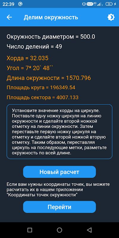 Konieczne jest wprowadzenie średnicy dzielącego się koła i liczby części, które można podzielić. Aplikacja oblicza wartość akordu.