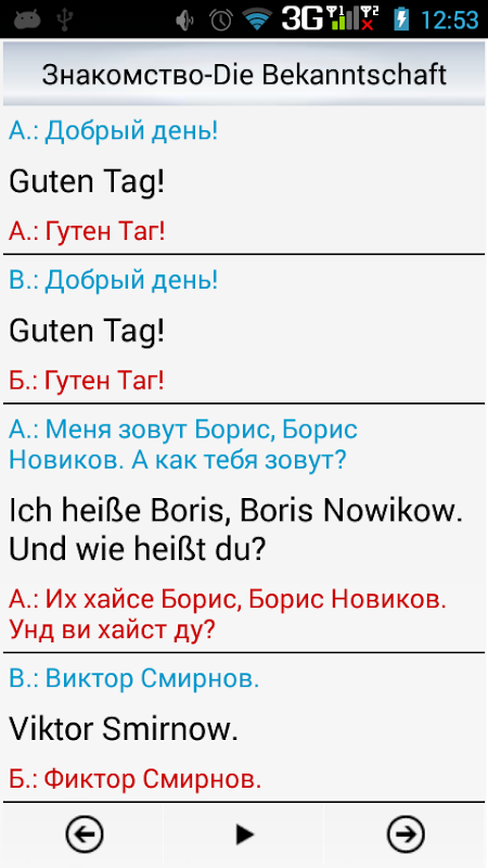 Dialogi, podzielone tematycznie, pomoże Ci szybko przejść sytuację i pomóc w rozmowach. Powitanie, spotkanie, spotkanie, o mnie, rozmów telefonicznych, Taxi, nocleg - wszędzie będziesz w stanie komunikować się, nawet przy najmniejszej znajomości języka.