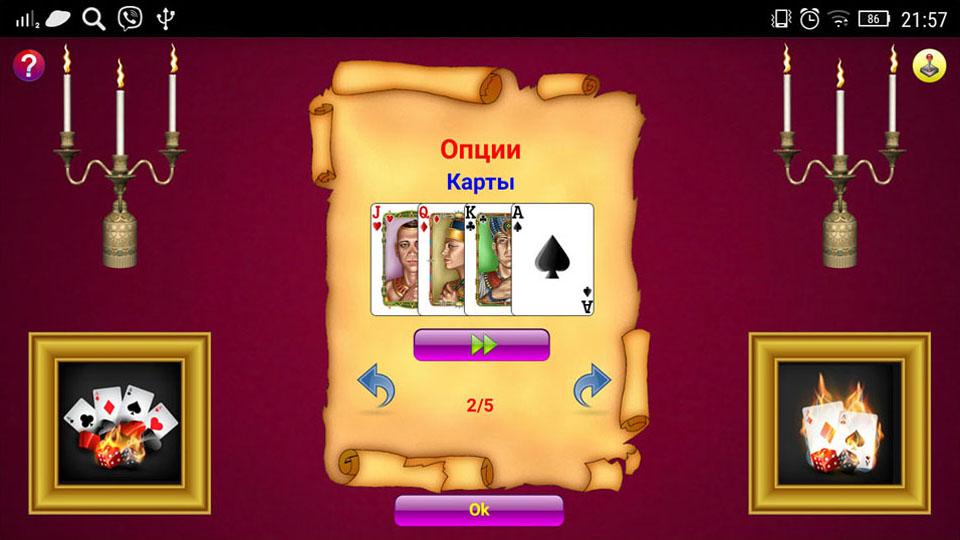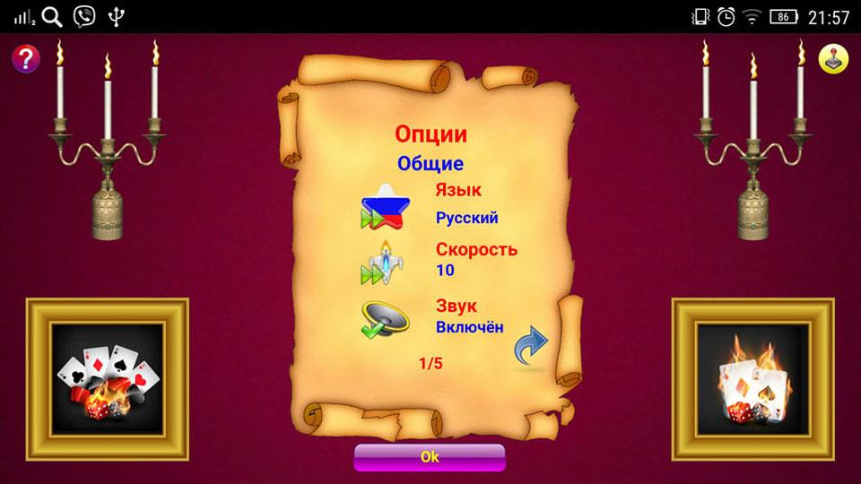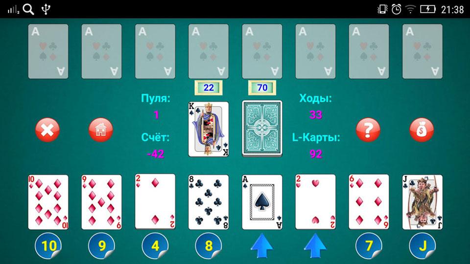 Неплохой дизайн, возможность менять колоды карт (3 колоды) и рубашки, звуковое сопровождение, оригинальное сохранение результатов игр. После сыгранной серии игр из 10-ти конов имеется возможность отослать свой счет на игровой сервер, так что любители этой игры по всему миру могут соревноваться между собой. Имеется возможность создавать свой аккаунт на нашем сервере и играть из-под своего аккаунта на рейтинг с любого PC и с любого Андроид-гаджета. Для полноценной работы игр гаджет должен быть подключен к интернету!