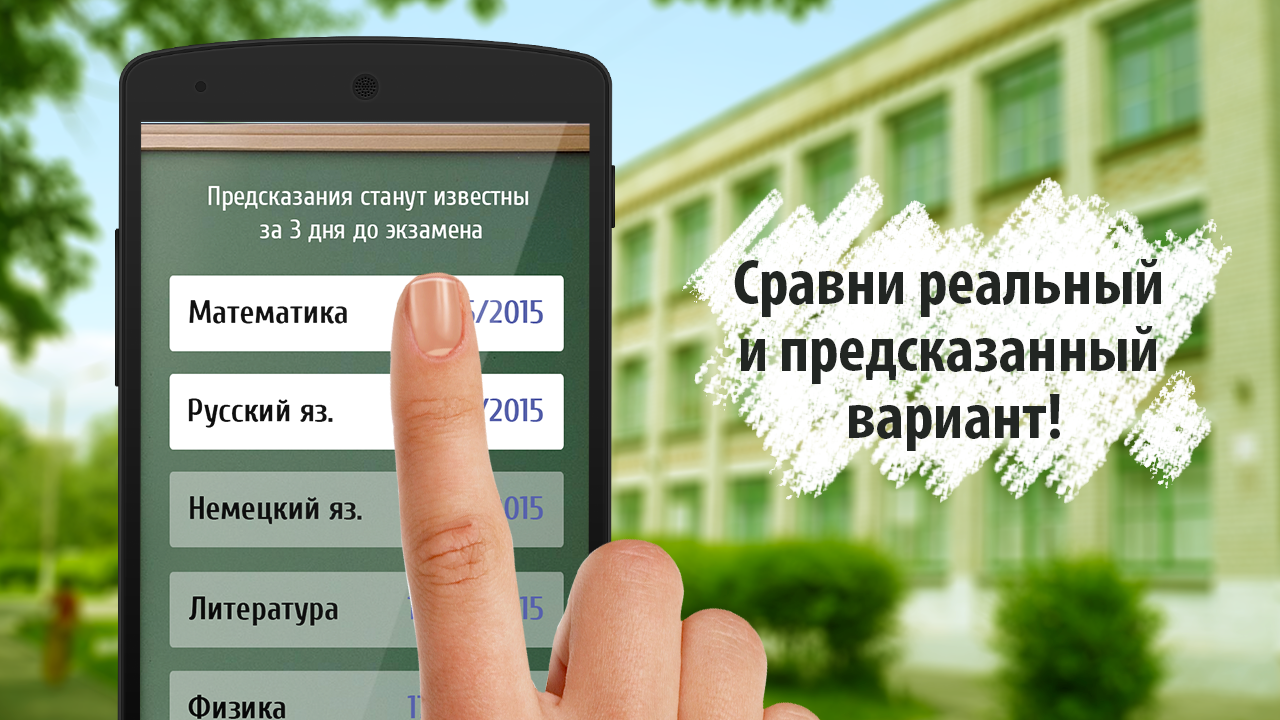 ЕГЭ экзамен 2015: Прогноз предлагает узнать результаты тестов по предметам на выпускном экзамене! Сдаешь русский язык, литературу, математику? Узнай как подготовила тебя школа к ЕГЭ! Выбери предмет из расписания, запусти Прогноз! Если не доволен результатом, измени уровень подготовки и напиши тесты как босс! Если результат прогноза хороший, покажи друзьям и продолжай готовиться, чтобы сдать ЕГЭ на отлично! Сравни результаты экзаменов с прогнозом после теста и поделись ими с учителями на выпускном!