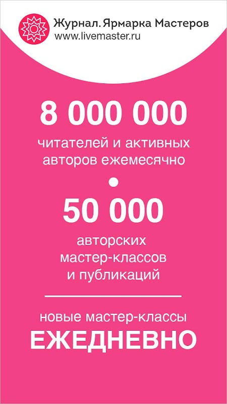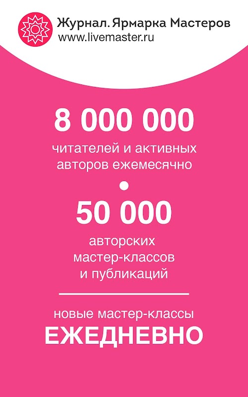 Zostań częścią największej kiermaszy tematyczna mistrzów (livemaster.ru) - główną platformą handlową na zakup i sprzedaż ręcznie wykonane dzieła chronionego prawem autorskim, w Rosji, na Ukrainie i WNP. Podziel twórcze odkrycia z przyjaciółmi i komunikować się z ludźmi o podobnych poglądach.