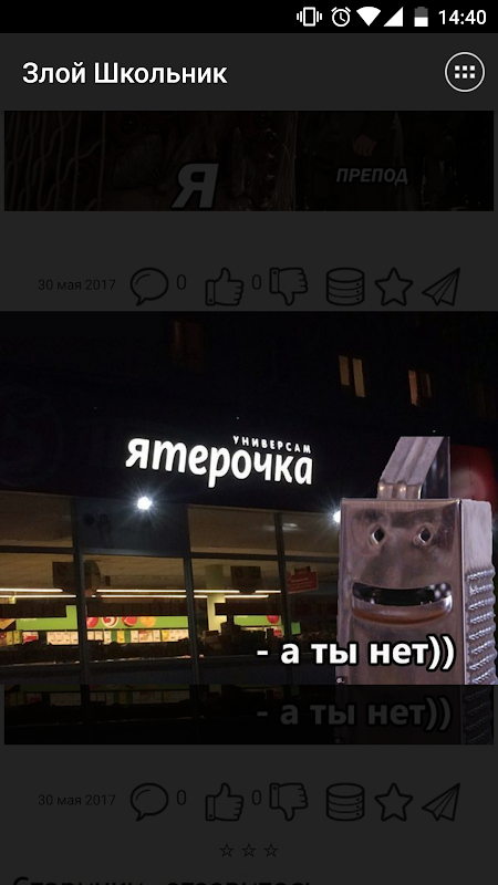 Позитивное приложение для тебя и твоих одноклассников! Проводи время весело в компании с отборными мемасами. Самые смешные картинки с приколами, ежедневное обновление. Прикольные анекдоты и смешные фотографии. Угарно, смотреть до конца, ржачные мемы, баяны из интернета, приколы с животными и котами, ржака и оборжаша, лолы и фотоприколы, фото с приколами, самые смешные картинки и мемчики. Позитив на каждый день! Комментируй мемасы и будь первым кто увидел прикол!