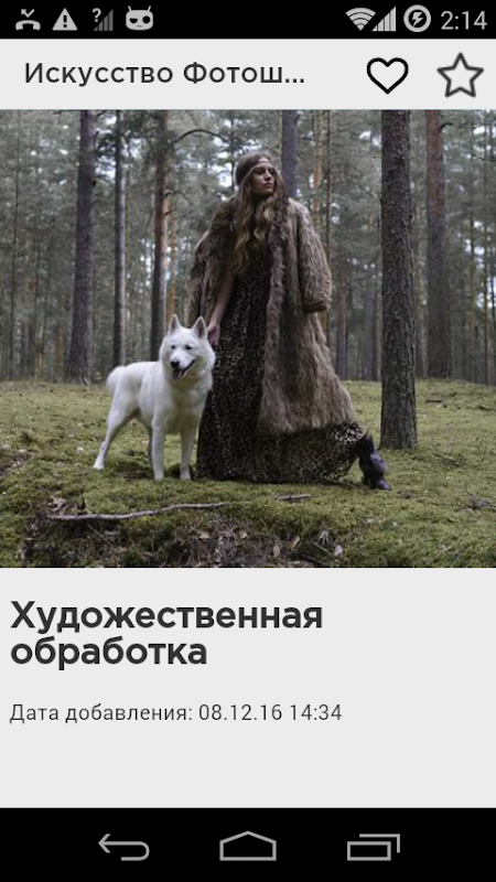 В приложении "Искусство Фотошопа" собрано огромное количество самых интересных материалов обработок фотографий, авторами, которых являются только опытные мастера. Приложение представляет собой фотоальбом, где можно найти каждому желающему интересные фотообработки. Все представленные работы имеют абсолютно разную тематику, с большим разрешением и в хорошем качестве.