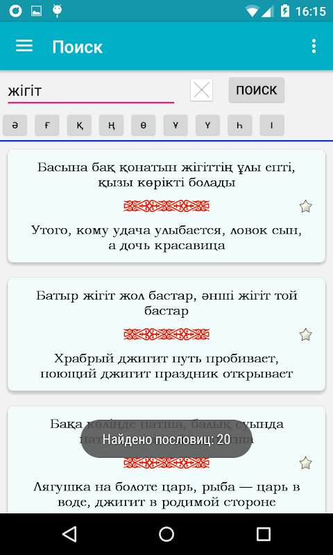 W tej chwili aplikacja zbiera się około 1500 przysłów i powiedzeń w języku kazachskim. Istnieje również rosyjskie tłumaczenie lub analog przysłowie w języku rosyjskim, podobne znaczenie do oryginału w języku kazachskim.