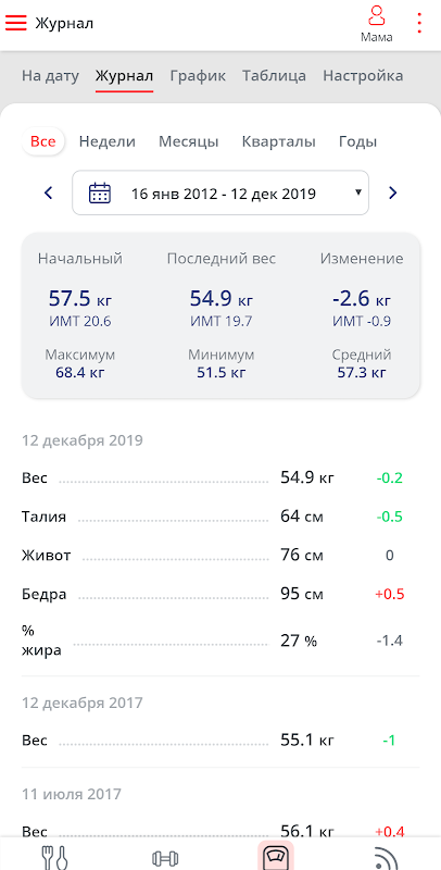 Wykresy wagi i ponad 10 innych pomiarów ciała.