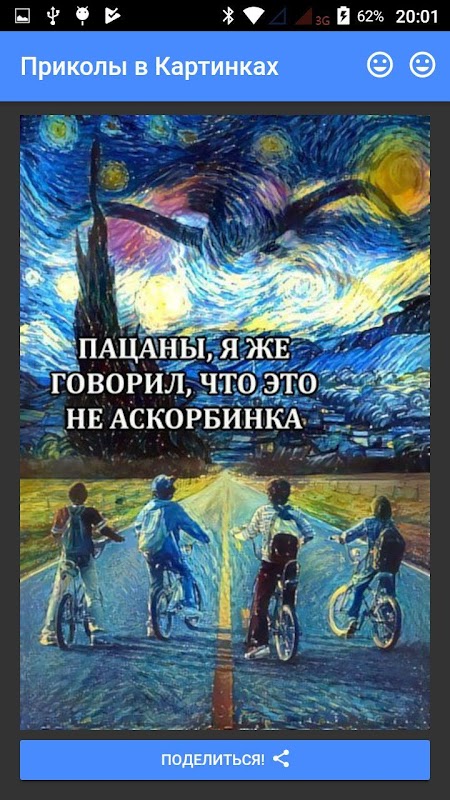 Настало время безудержного веселья с приложением Картинки Приколы! Все что может развеселить любого человека, свежие приколы, мемы, картинки на телефон приколы, а также картинки смешные приколы, смешные анекдоты и приколы с смешные картинки обновляются в нашем приложении несколько раз в день. Если вы искали приколы картинки без интернета, а также где скачать картинки приколы - вы попали по адресу. Приколы картинки демотиваторы не оставят никого равнодушным, а убойные приколы картинки заставят смеяться до слез любого.