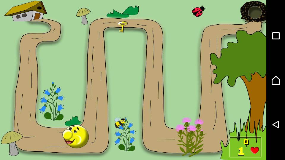 15 уровней - 15 лабиринтов (в Lite версии доступны сразу 10 из них) красивой 2D и псевдо-3D  графики и прикольных звуков, которые предстоит пройти, катая  Колобок, наклоняя в разные стороны смартфон/планшет (используется акселерометр - G-Sensor). Игра увлечет самого юного геймера лет от 5. Собственно она и написана для семейного совместного развлечения. Дети от 3 лет могут пробовать свои силы уже сейчас.  В начале все легко и просто. Начиная с 5 уровня появляются зверушки. Они так же управляются игроком, но призваны усложнить игру. При встрече с зверушкой (зайцем, медведем, волком, лисой, ежиком ) - теряется одна жизнь. Если вместо Колобка на переход уровня попала зверушка - вас откинет назад на один уровень. Так же в игре есть, как помогающие, так и осложняющие игру эффекты в виде знаков вопроса, которые можно подбирать, как самим Колобком, так и управляемой зверушкой. Имена игроку присваиваются произвольно. Игра использует датчик акселерометра. Из настроек - звук музыкального сопровождения и определение начального наклона смартфона/планшета. Реклама отсутствует, как класс.