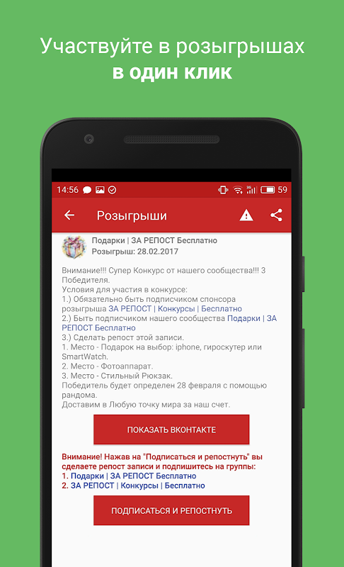 Aplikacja zawiera konkursy i loterie prowadzone w grupach VKontakte.