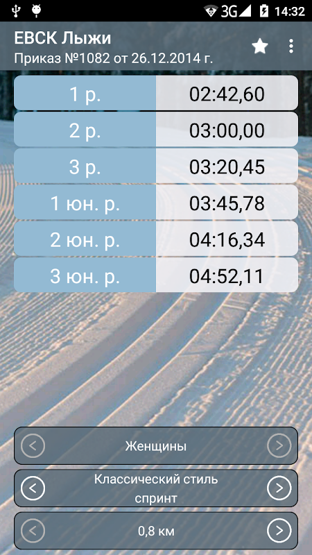 Если вы хотите знать с каким временем вам нужно ехать на лыжах, чтобы получить спортивный разряд или спортивное звание эта программа будет вам весьма кстати.