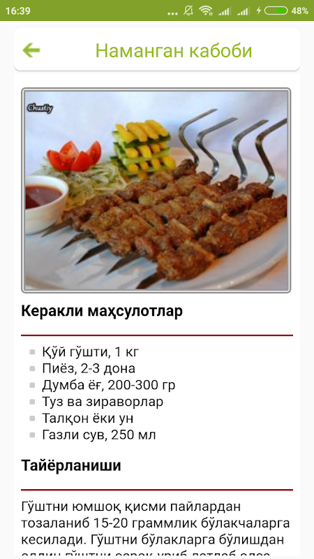 Mans Andy pożary, honim, dўlma, szaszłyk, Noreen, dla OBI, patir Soamesa, yupқa, bўғirsoқ, chuchvara, mastava, Sumalak, nisholda wa boshқa kўplab noobem retseptlar қўl ostingizda.