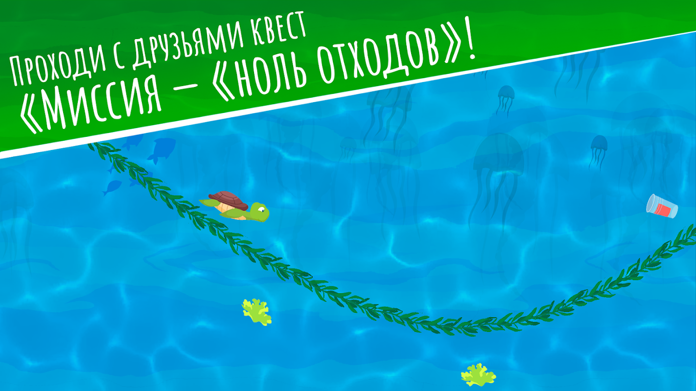 Простая механика увлечет вас надолго! Ведите черепашку вдоль водорослей, помогая ей съедать встречающиеся на пути водоросли и рыбок и избегать пластикового мусора, который крайне опасен для обитателей океана!