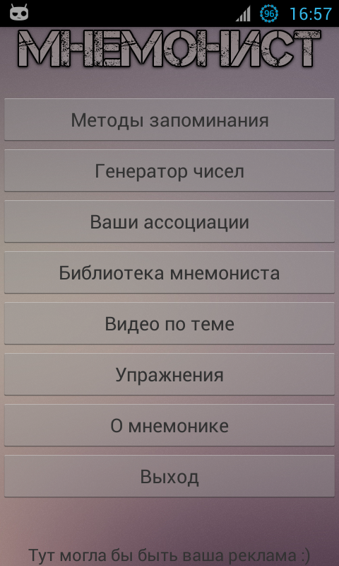 Ta aplikacja pomoże Ci w rozwoju pamięci i jego szkolenia. Dzięki specjalnych ćwiczeń można uzyskać umiejętności zapamiętywania liczb, słów i tekstów, rozwijać uwagę i twórcze myślenie. Dzięki dobrej pamięci, będziesz w stanie szybko przyswoić informacje, będą mogli poruszać się po morzu informacji, aby podjąć właściwe decyzje.