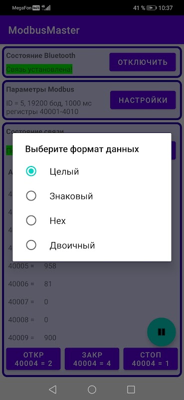 Приложение позволяет в режиме мастера удаленно через Bluetooth подключиться к любому устройству по протоколу Modbus RTU. Для этого еще необходим переходник, который легко реализовать с помощью Arduino и любого другого контроллера. Переходник получает мастер запрос от телефона в виде байтового массива. Ответ от подчиненного устройства преобразуется в HEX-строку и передается обратно в смартфон.