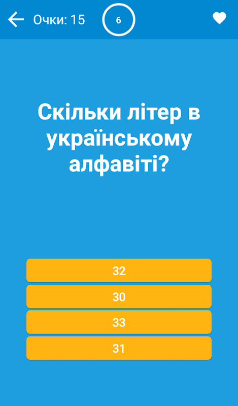 На кожне питання дається 10 секунд і 4 варіанти відповіді. Відповісти неправильно можна тільки 3 рази за гру. Встановлюйте рекорди та змагайтеся з друзями! Приємної гри!