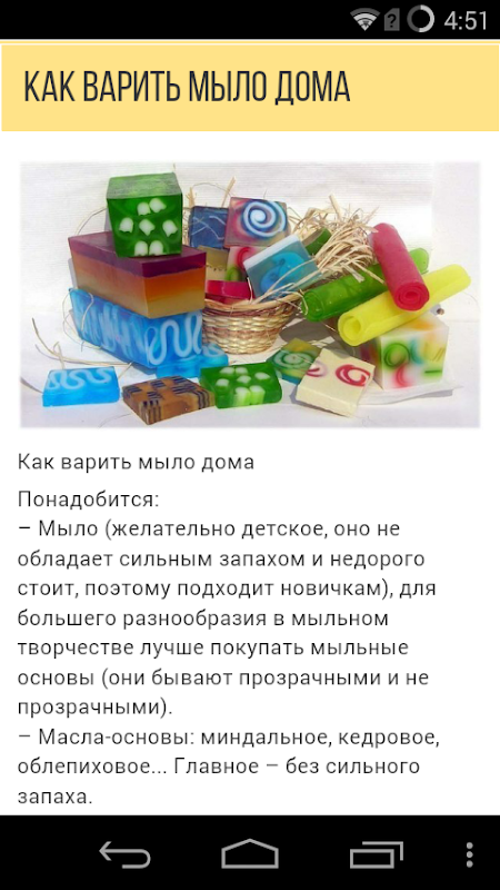 На первый взгляд может показаться, что изготовление мыла в домашних условиях непростое дело и требует каких-либо специальных знаний. На самом деле технология мыловарения достаточно проста, а необходимые компоненты можно найти как в интернет-магазинах, так и в аптеке или в обычном магазине. Ручное мыло можно изготовить из необходимых конкретно Вам ингредиентов, и в этом случае оно будет не только очищать Вашу кожу, но и нежно ухаживать, питать и увлажнять ее. А еще яркое, вкусно пахнущее мыло необычных форм может стать отличным подарком любому человеку – начиная от малыша, любящего плескаться в ванной, до зрелого отца семейства, который предпочитает неординарные вещи.