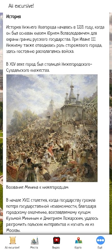 W tej aplikacji możesz zapoznać się z Niżnym Nowogrodem, wybrać miejsce na wycieczkę, przeglądając zabytki i recenzje wideo. Zapoznaj się z historią Niżnego Nowogrodu. Aplikacja zawiera również informacje o agencjach turystycznych i hotelach oferujących swoje usługi w Niżnym Nowogrodzie. Sekcja - Numery alarmowe zawiera informacje z numerami pomocy w nagłych wypadkach podczas wycieczki lub wycieczki po Niżnym Nowogrodzie.