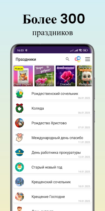 Ta sekcja katalogu zawiera pocztówki na wszystkie okazje - poświęcone ogólnokrajowym świętom (zarówno świeckim, jak i religijnym), zawodowym lub dniom uhonorowania niektórych kategorii obywateli - osób starszych, dzieci, młodzieży itp. Różnią się wyglądem i zawartością. Na przykład dla szefa lub kolegi z pracy możesz wybrać ścisłą i elegancką pocztówkę, dla dziewczyny - pięknej i romantycznej, dla przyjaciela - fajne.