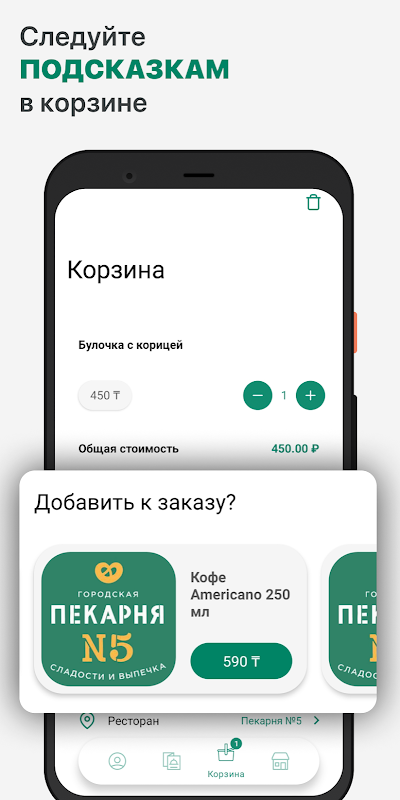 Jak złożyć zamówienie w aplikacji „Piekarnia #5”: wybierz z menu pozycje, które Ci się podobają, dodaj je do koszyka i przejdź do ekranu kasy (klikając w ikonę koszyka).