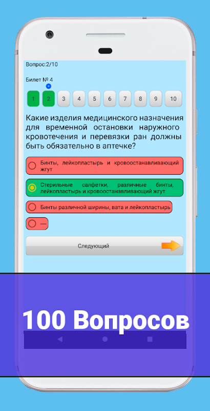 Aplikacja składa się z 10 biletów w każdym z 10 pytań.