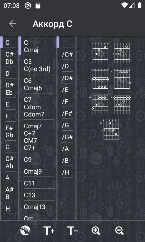 - konfigurowalne czcionki wyświetlające 14 akordów z różnymi kolorami akordów i tła