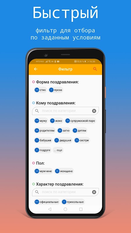 W aplikacji Gratulacje! robi się to bardzo prosto - wpisz słowo lub jego część, której potrzebujesz („mama”, „kwiaty”, „miłość”, „pokój”, „szczęście”, „rybak”, „syn” itp.) i od tysięcy gratulacji w dniu narodzin widzisz tylko te, których szukałeś.