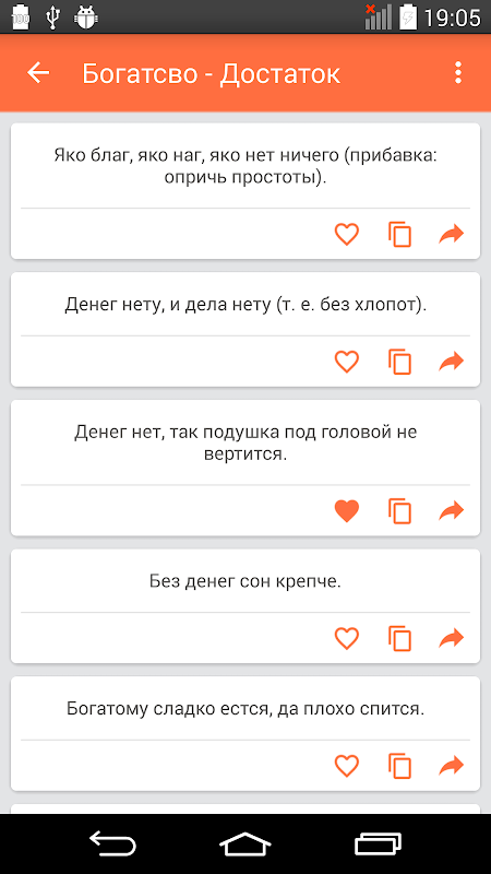В приложении удобная навигация. Пословицы и поговорки разбиты на категории по тематике и происхождению. Присутствует поиск. В данном приложении предусмотрена возможность добавить любимые пословицы и поговорки в избранное, поделиться с друзьями по почте, смс или соцсети, а так же скопировать. Присутствует раздел "Мои пословицы и поговорки" в который вы можете добавлять пословицы и поговорки которых нет в базе. Так же есть возможность установить закладку на определенной пословице или поговорке, что бы затем вернуться к чтению с того же места.
