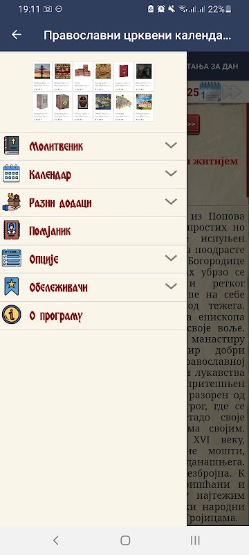 - W programie znajduje się także kalendarz cerkiewny z datami postów w ciągu całego roku i żywotami świętych - prolog ochrydzki na każdy dzień roku. Życie i czyny świętych Kościoła prawosławnego opisane są w żywotach świętych.