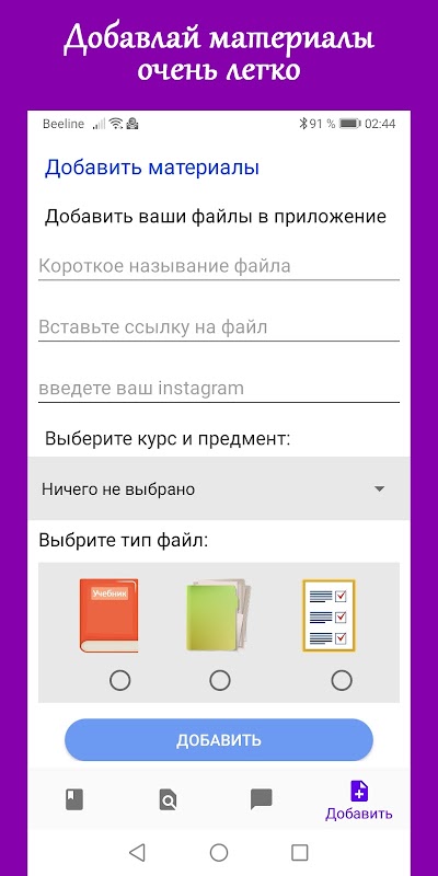 - добавлять учебные материалы в приложение (чтобы делиться с другими студентами)