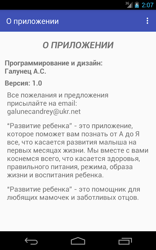 “Развитие ребенка” - это отличное приложение, которое поможет вам познать от А до Я все, что касается развития малыша на первых месяцах жизни. Мы вместе с вами коснемся всего, что касается здоровья, правильного питания, режима, образа жизни и воспитания ребенка.