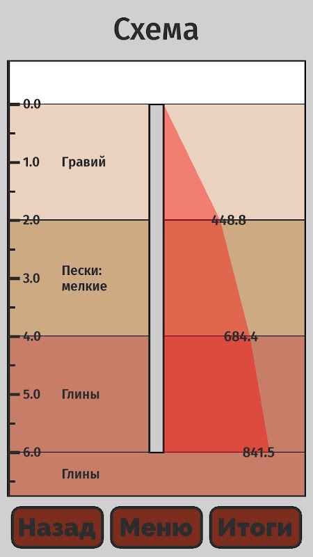 Program wyświetla wykres z obliczonymi wartościami sił oporu zarówno wzdłuż powierzchni bocznej, jak i pod podeszwą. Wyświetla również formularz, w którym podane są zarówno wartości obliczone, jak i standardowe.