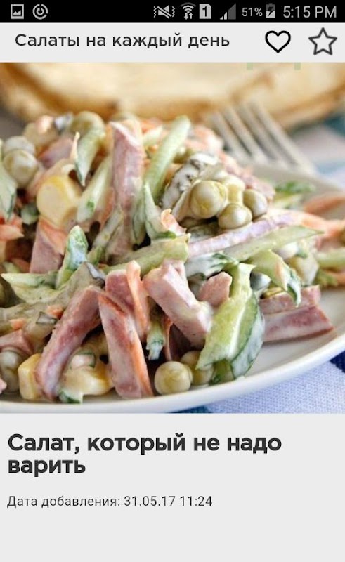 Aplikacja „Przepisy na sałatki” można znaleźć wiele receptur. Sałatki mogą być przygotowane w postaci warzyw, i owoców. Istnieje również duża liczba ciekawych decyzji mięsa, sery, owoce morza. Odpowiedni dobór składników sałatek mogą czasami z prostych składników, aby stworzyć prawdziwe kulinarne arcydzieło. Weźmy na przykład prostą kombinację - marchew, jabłko, śmietanę - i będzie na stole być wielki „szybko” przystawka, po prostu pyszne sałatki. Albo jeszcze prościej - ogórki z kwaśną śmietaną. Jest to „Sałatka jest proste i pyszne!”