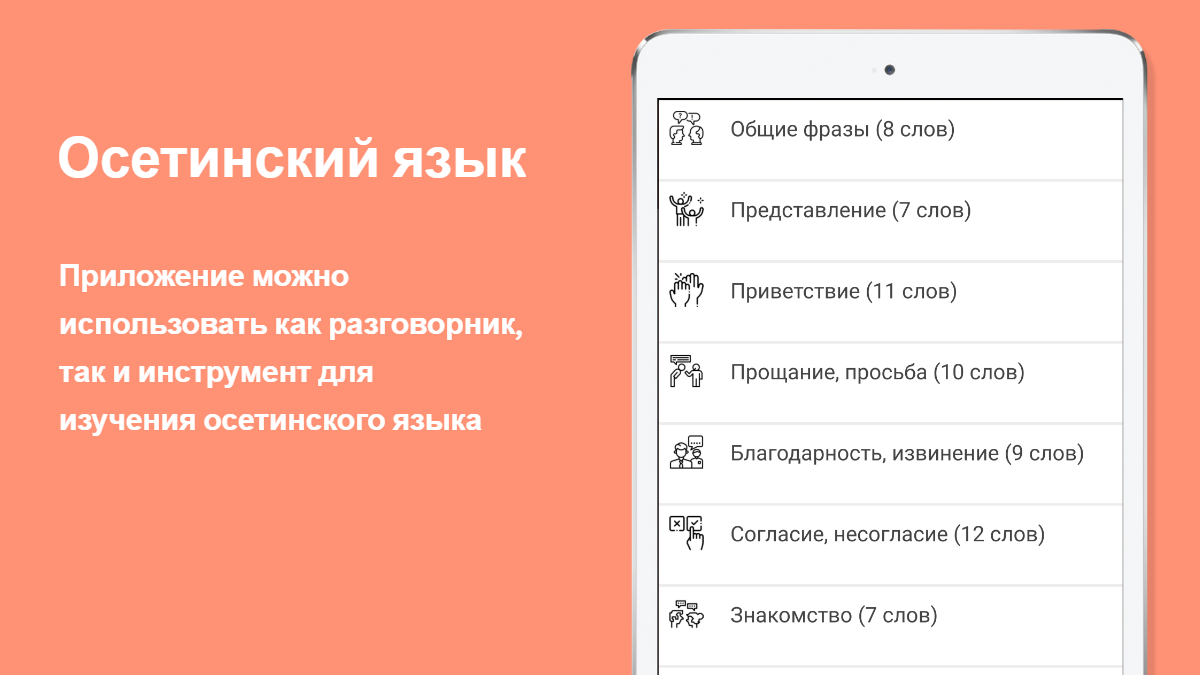 Rozmówki rosyjsko-osetyjskie mogą być używane odpowiednio jako rozmówki i narzędzie do nauki języka osetyjskiego. Wszystkie słowa osetyjskie są pisane rosyjskimi literami i są podzielone na 10 logicznych tematów, to znaczy rozmówki są przeznaczone dla rosyjskojęzycznego użytkownika (turysty).